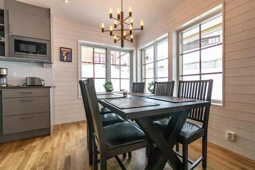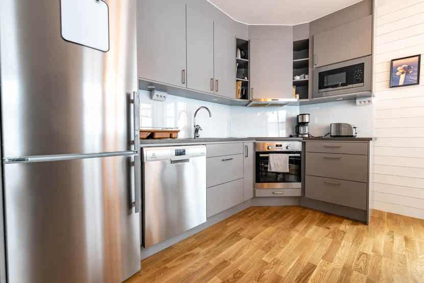 Køkkenet indeholder: keramiske kogeplader, indbygningsovn, køleskab, frys, opvaskemaskine, microovn.