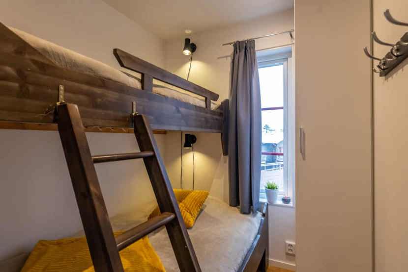 Soveværelse-1= 1 dobbeltseng. Soveværelse-2= 1 køjeseng med 120 cm bred underkøje . Soveværelse-3= 1 køjeseng med 120 cm bred underkøje .