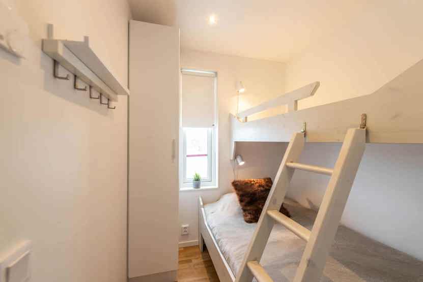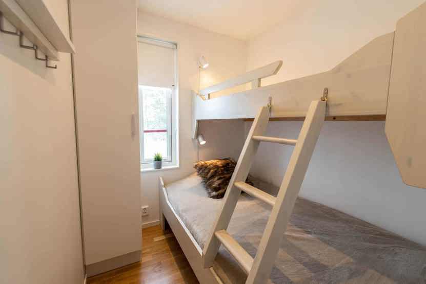 Soveværelse-1= 1 dobbeltseng. Soveværelse-2= 1 køjeseng med 120 cm bred underkøje . Soveværelse-3= 1 køjeseng med 120 cm bred underkøje .