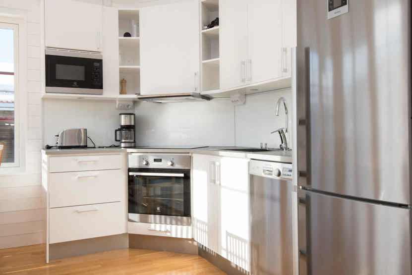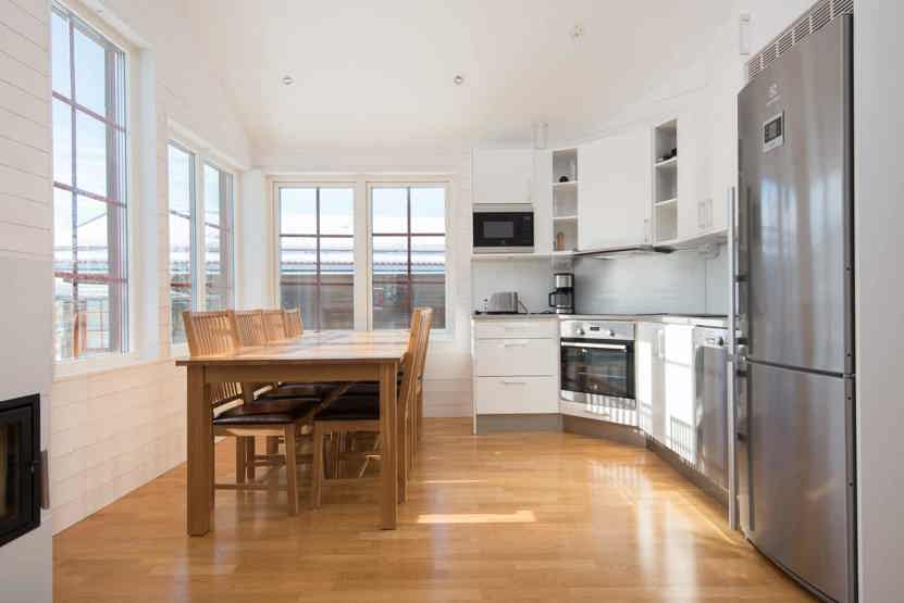 Køkkenet indeholder: keramiske kogeplader, ovn, køleskab, frys, opvaskemaskine, microovn.