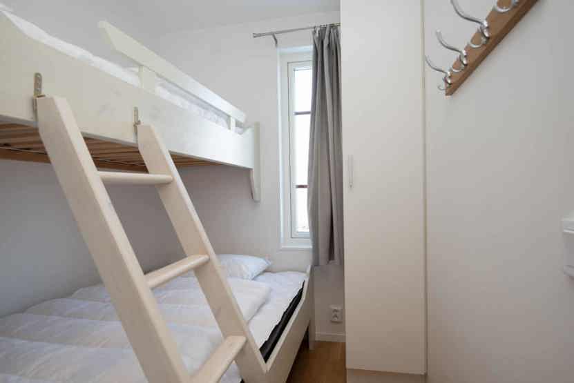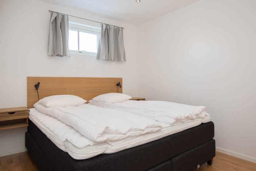 Soveværelse-1= 1 dobbeltseng 180 cm bred. Soveværelse-2= 1 køyeseng med 120 cm bred underkøye og 80 cm bred overkøye. Soveværelse-3= 1 køyeseng med 120 cm bred underkøye og 80 cm bred overkøye.