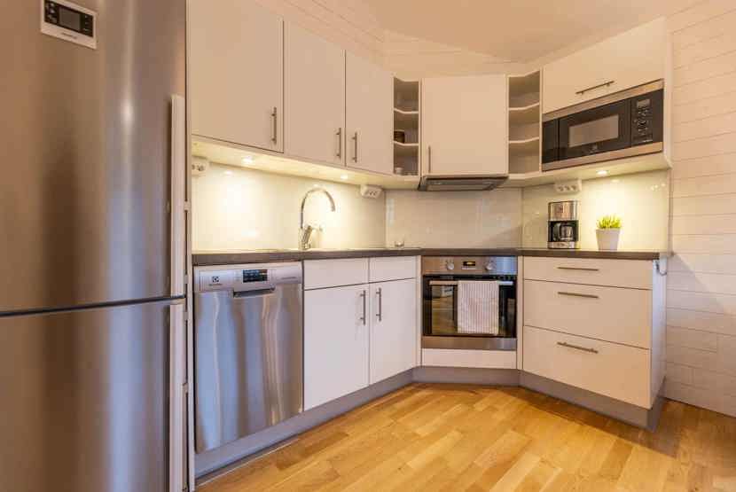 Køkkenet indeholder: elkomfur med ovn, køleskab, frys, opvaskemaskine, microovn.