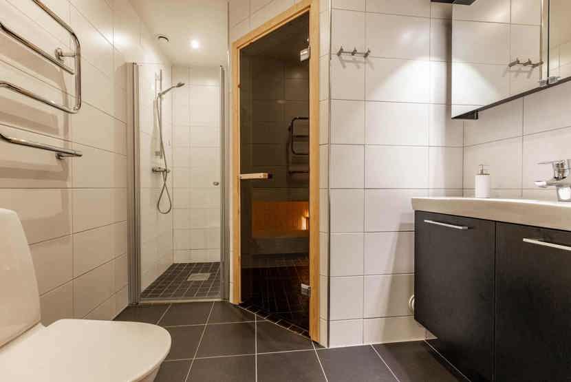 Badeværelset-1 = bruse/wc/sauna. Badeværelset-2 = wc.