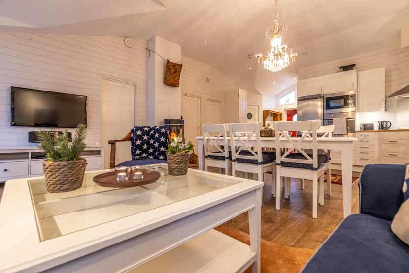 Opholdsstue med køkkenafdeling. TV, tørreskab, brændeovn (brænde indgår ikke), vaskemaskine, skistøvletører, rum til skiudstyr, (balkonen må ikke anvendes).