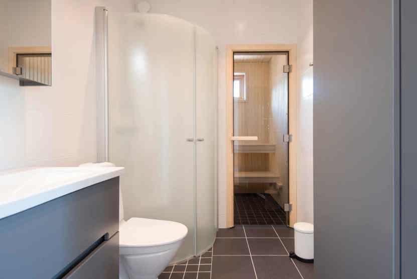 Badeværelset-1 = bruse/wc/sauna. Badeværelset-2 = wc.