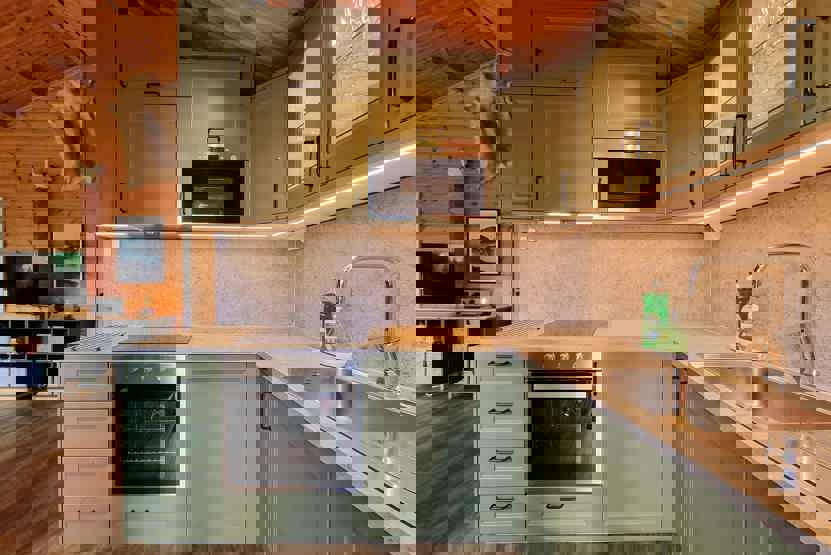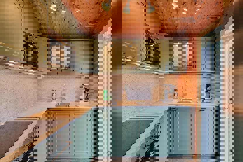 Køkkenet indeholder komfur med ovn, køleskab med fryser, opvaskemaskine, mikro.
