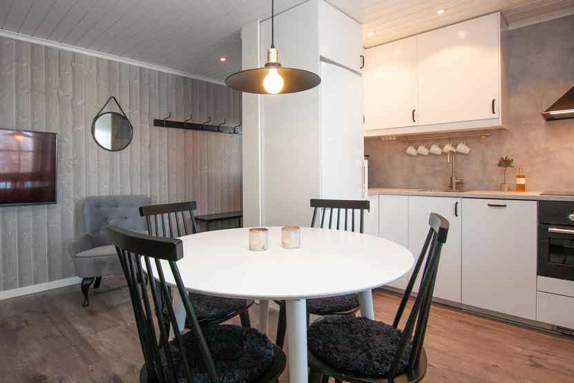 Køkkenet indeholder kombineret ovn og mikroovn, køleskab, induktionskomfur, fryser, opvaskemaskine.
