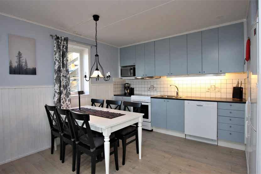 Køkkenet indeholder komfur med ovn, mikro, køleskab, fryser, opvaskemaskine.