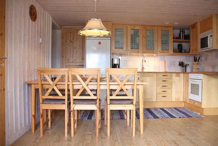 Køkkenet indeholder komfur, ovn, køleskab med fryser, opvaskemaskine, mikro.