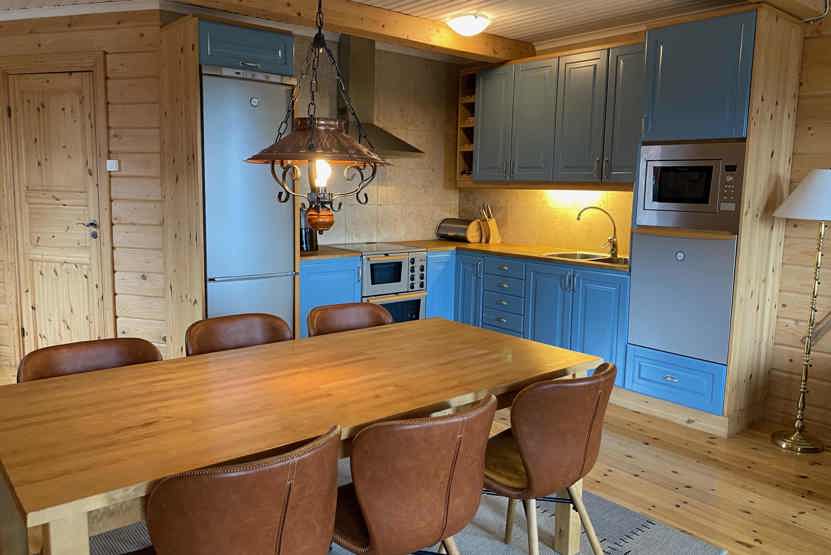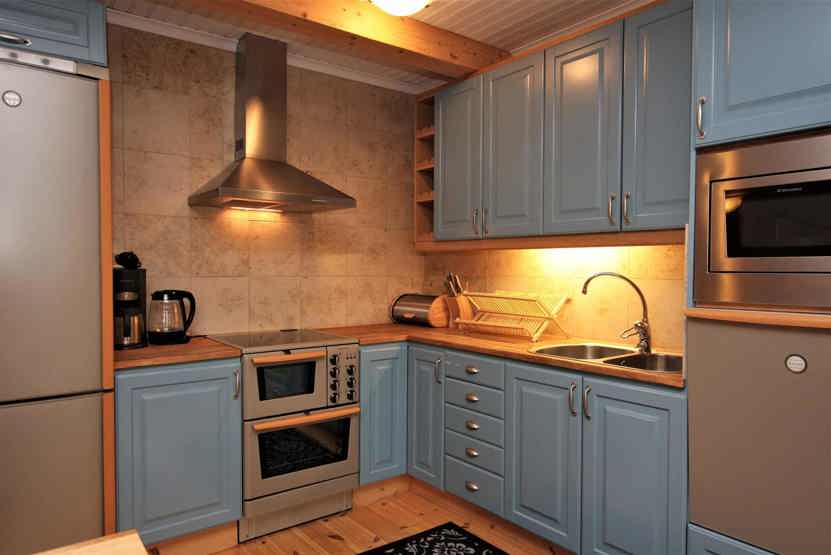 Køkkenet indeholder komfur, ovn, køleskab med fryser, opvaskemaskine, mikro.