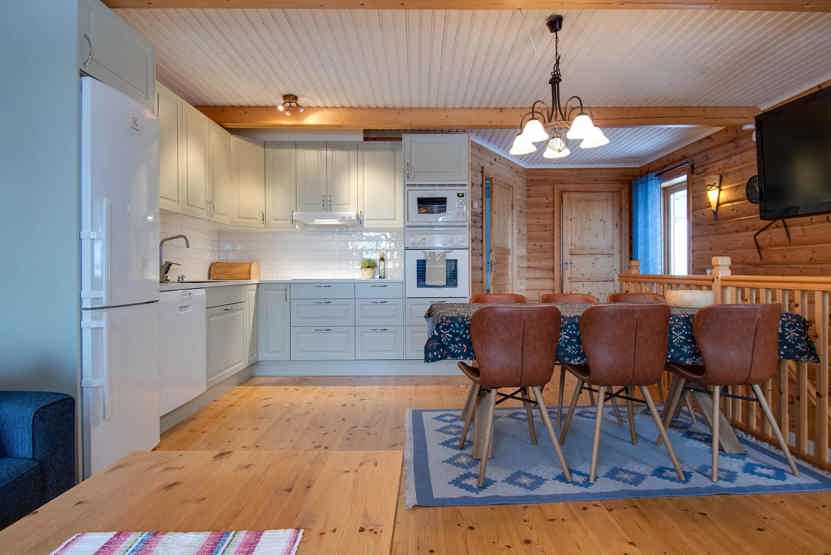 Køkkenet indeholder komfur, ovn, køleskab med fryser, opvaskemaskine, mikro.