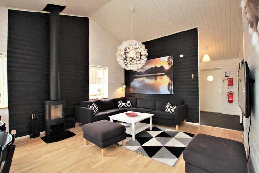 Stue med TV, lille køkkenafdeling, brændeovn (brænde indgår ikke).