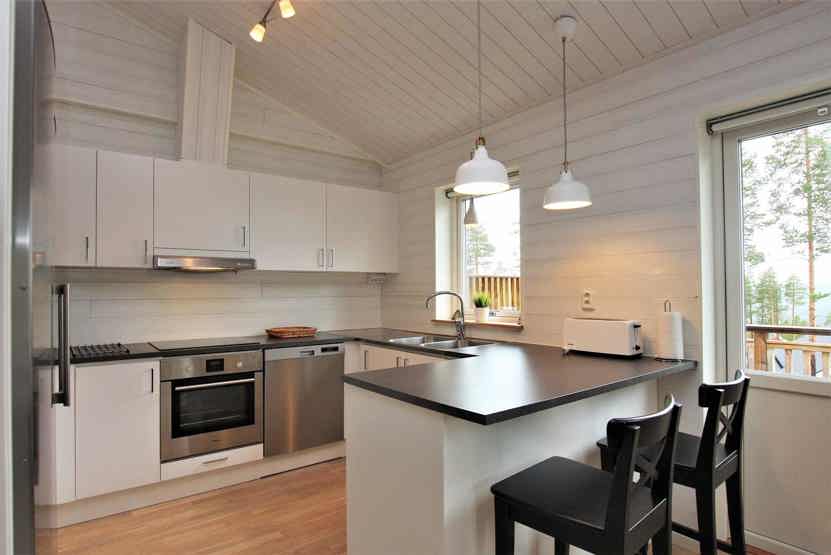 Køkkenet indeholder komfur med ovn, mikro, køleskab, fryser, opvaskemaskine.