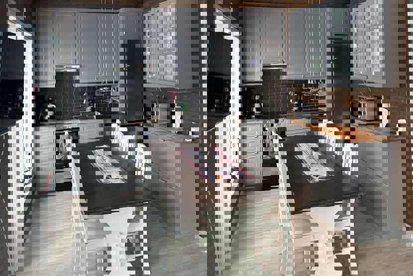 Stue med lille køkkenafdeling, TV.
