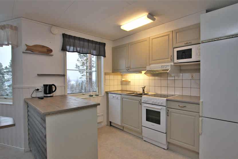 Køkkenet indeholder komfur med ovn, mikro, køleskab med fryser, opvaskemaskine.