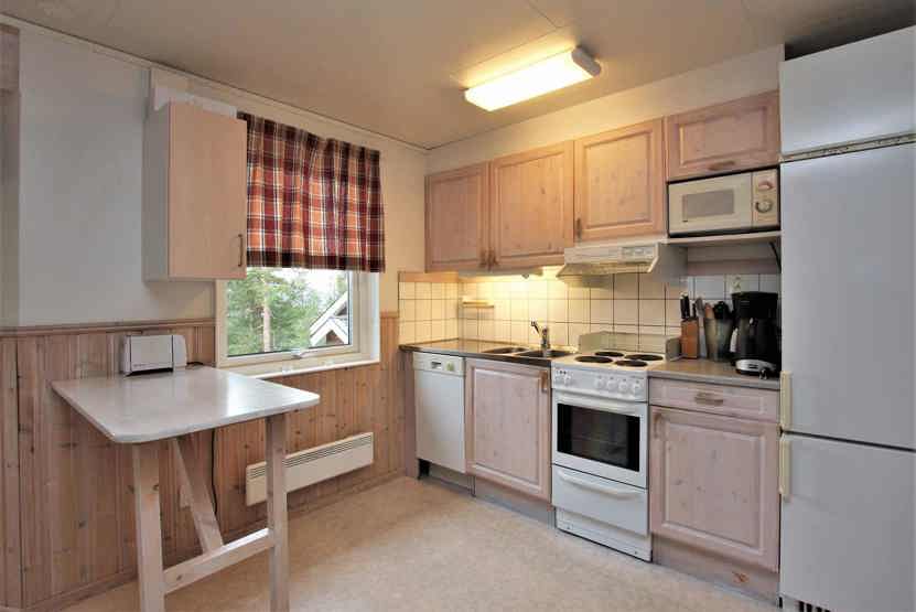 Køkkenet indeholder komfur med ovn, mikro, køleskab med fryser, opvaskemaskine.