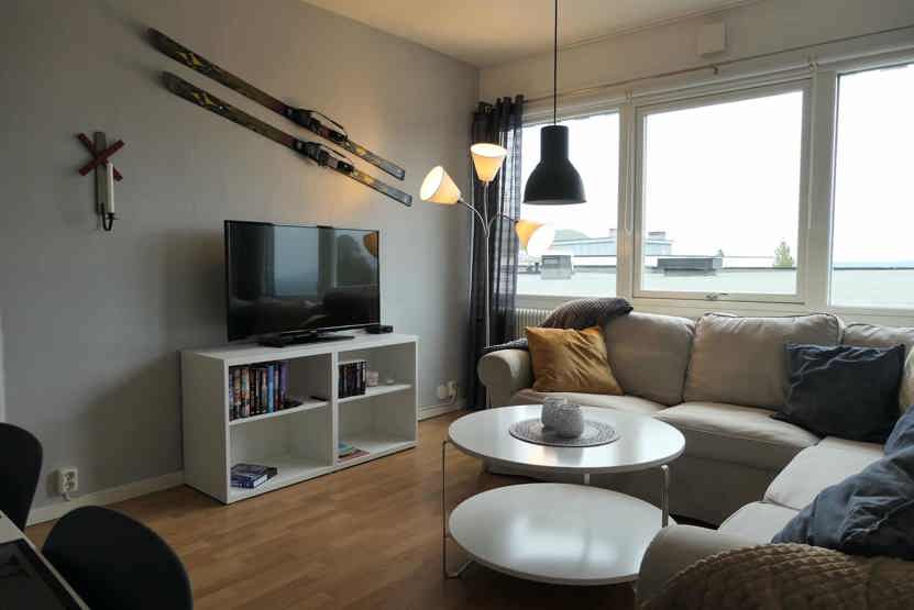 Stue med TV, lille køkkenafdeling.