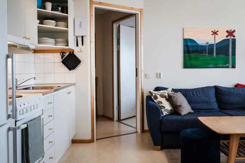 Stue med TV, lille køkkenafdeling, sovesofa.