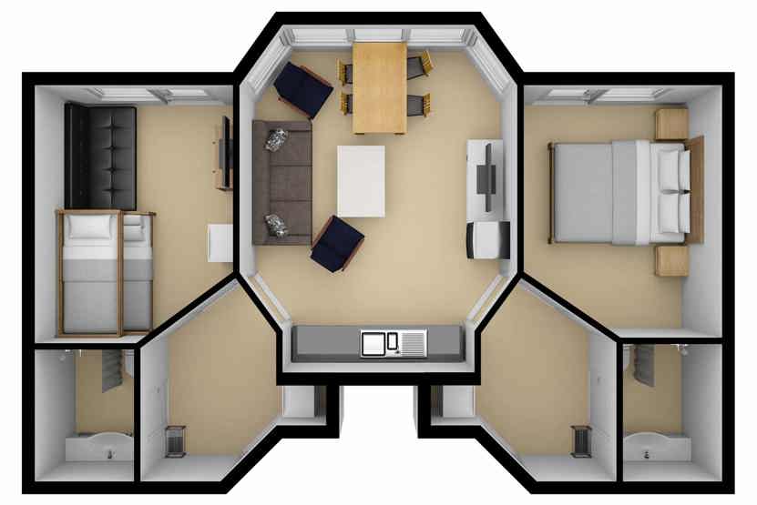 Stue med TV, lille køkkenafdeling, sovesofa.