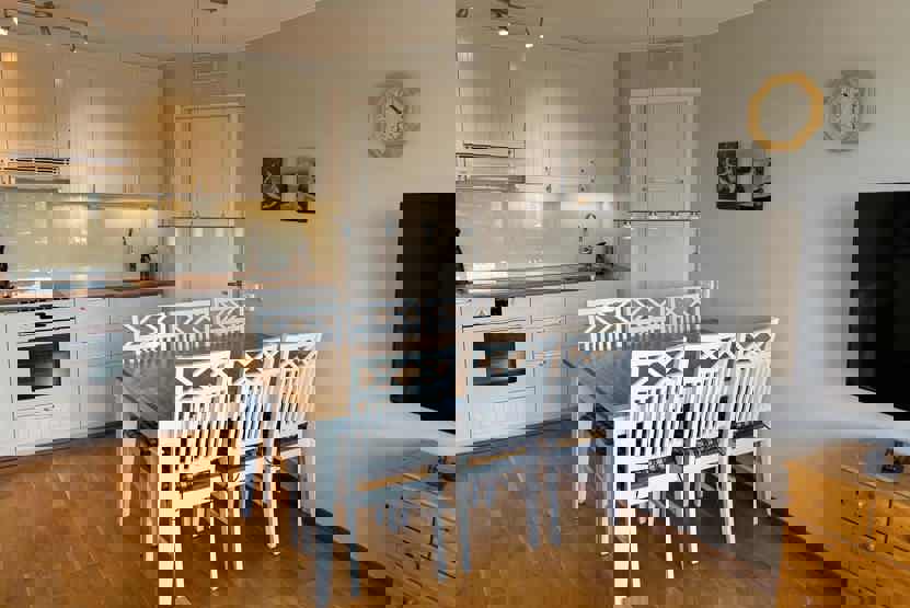 Køkkenet indeholder komfur med ovn, køleskab, fryser, mikro, opvaskemaskine.