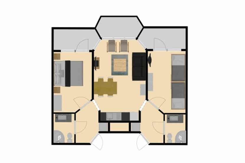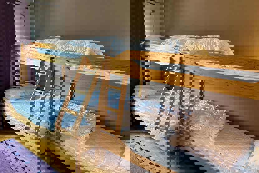 Soveværelse-1 = 1 dobbeltseng 180 cm bred. Soveværelse-2 = 1 køjeseng hvor både over og underkøje er 80 cm bred, 1 køjeseng med 120 cm bred underkøje og 80 cm bred overkøje.