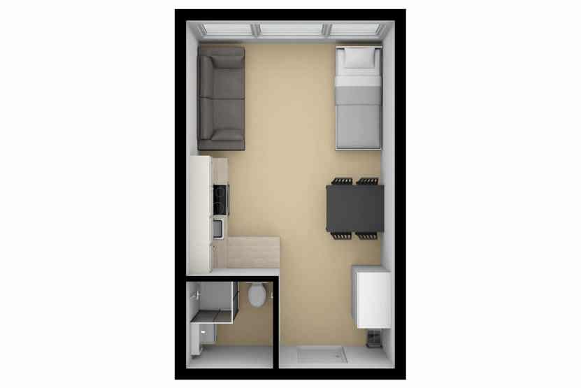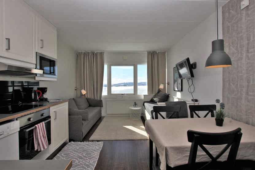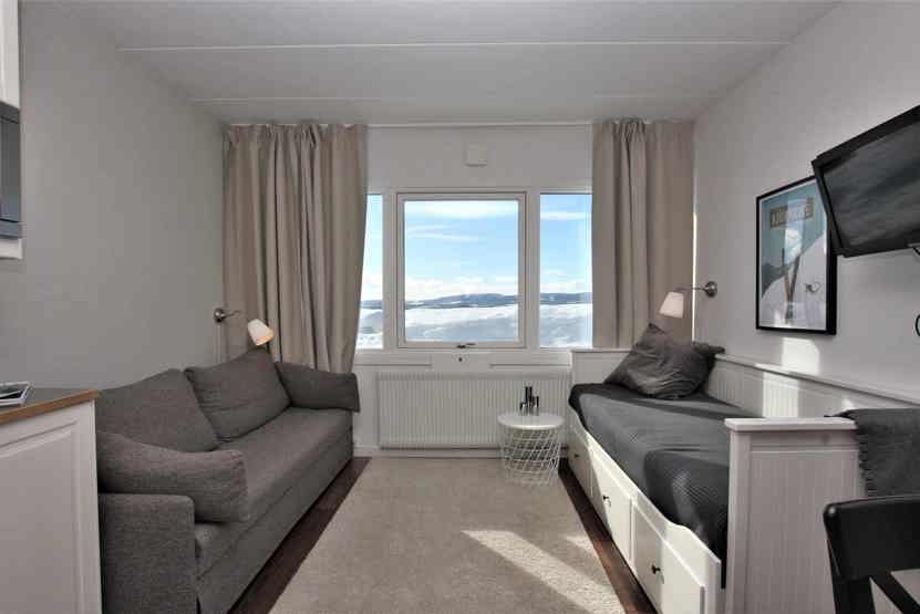 Stue med TV, 1 sovesofa, sovesofa til 2 personer, kombinerad sov och köksavdelning.