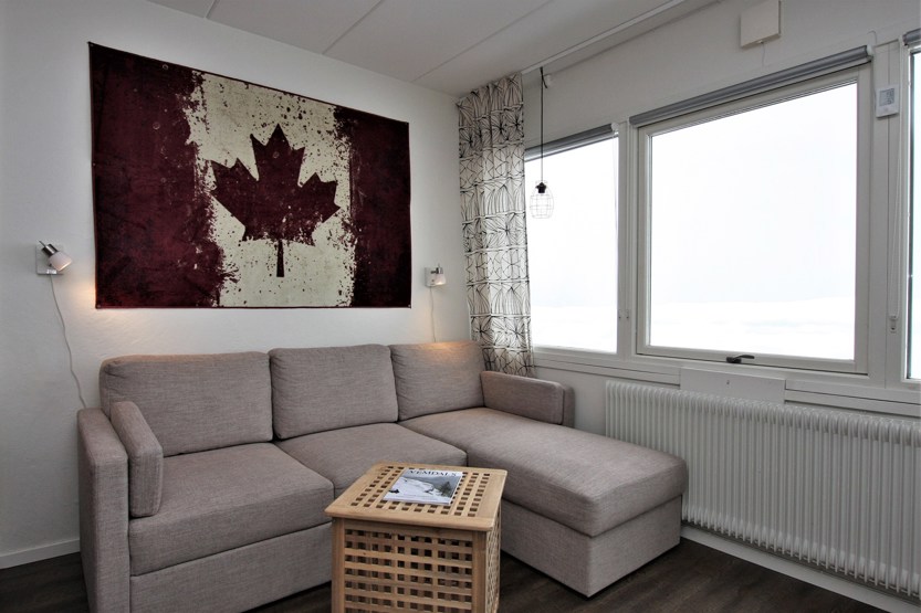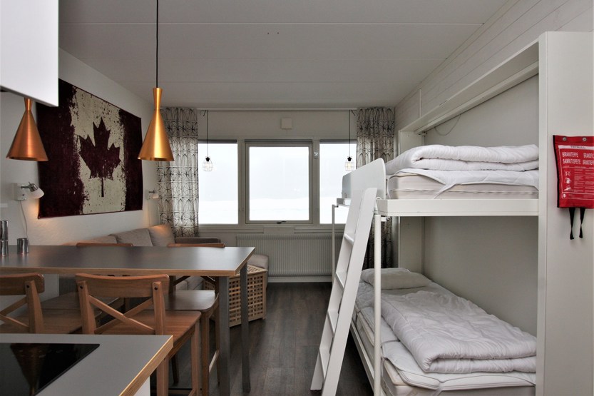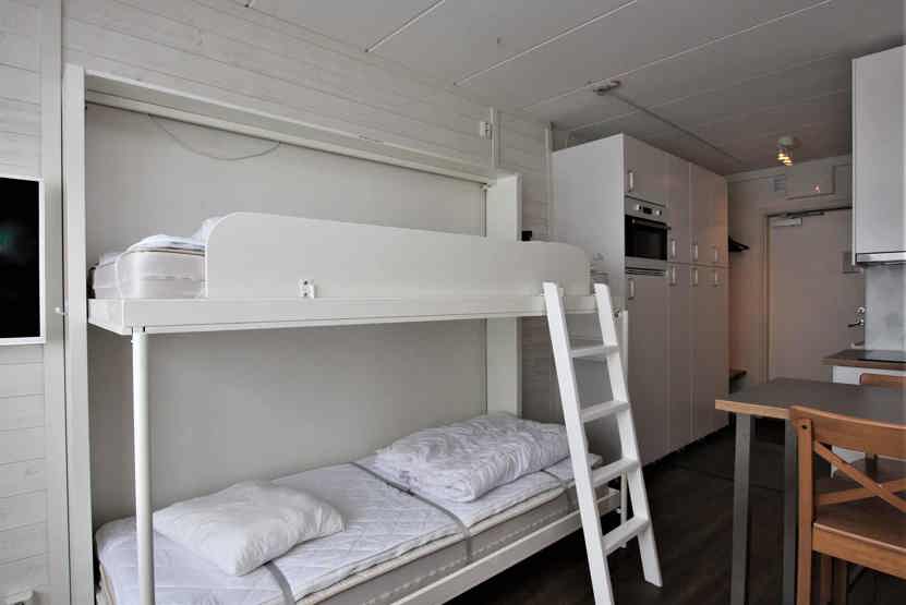 Stue med en våningssäng (90 cm bred) i ett sängskåp i allrummet, TV, sovesofa, kombinerad sov och köksavdelning.