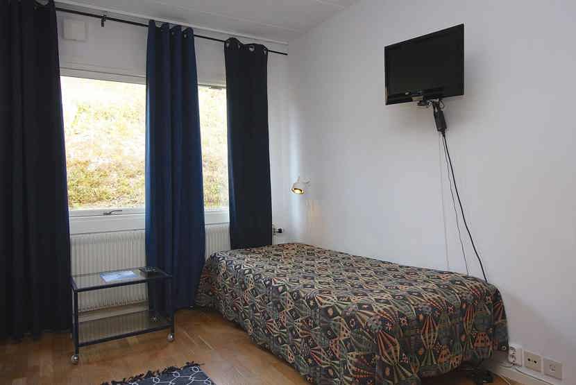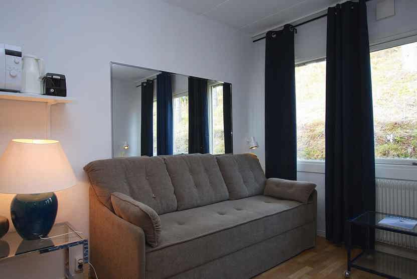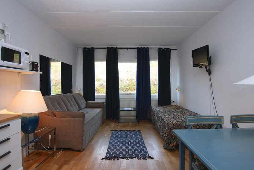Stue med TV, 1 enkeltseng, sovesofa til 2 personer, kombinerad sov och köksavdelning.