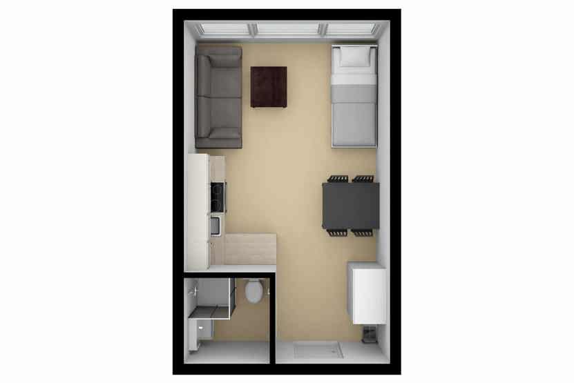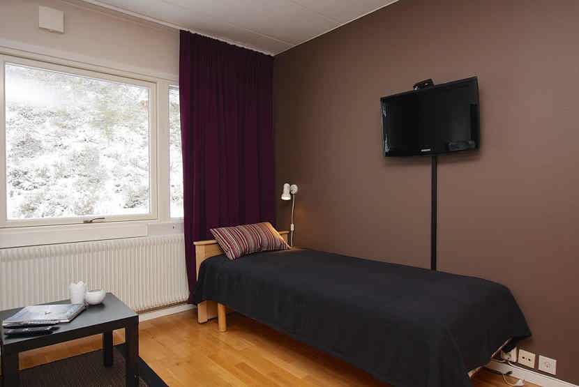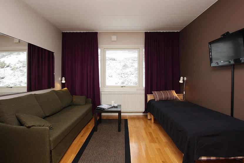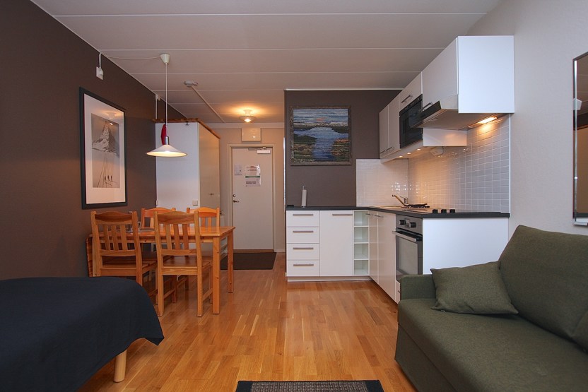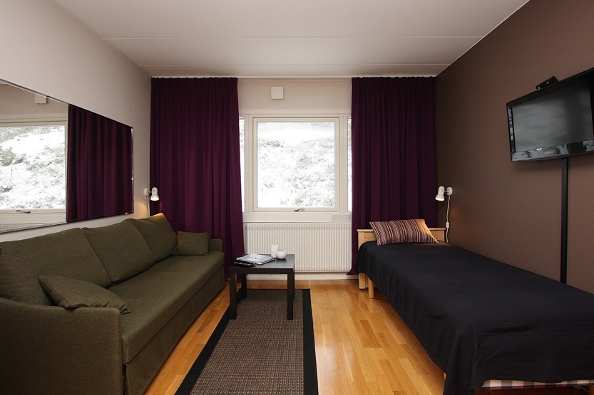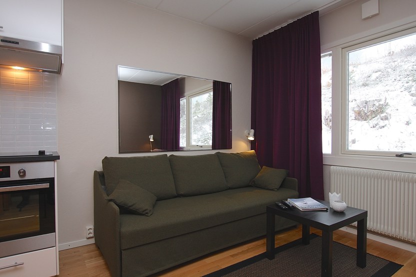 Stue med TV, 1 enkeltseng, sovesofa til 2 personer, kombinerad sov och köksavdelning.