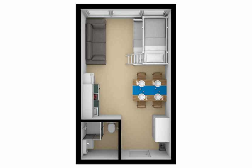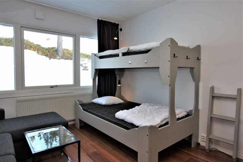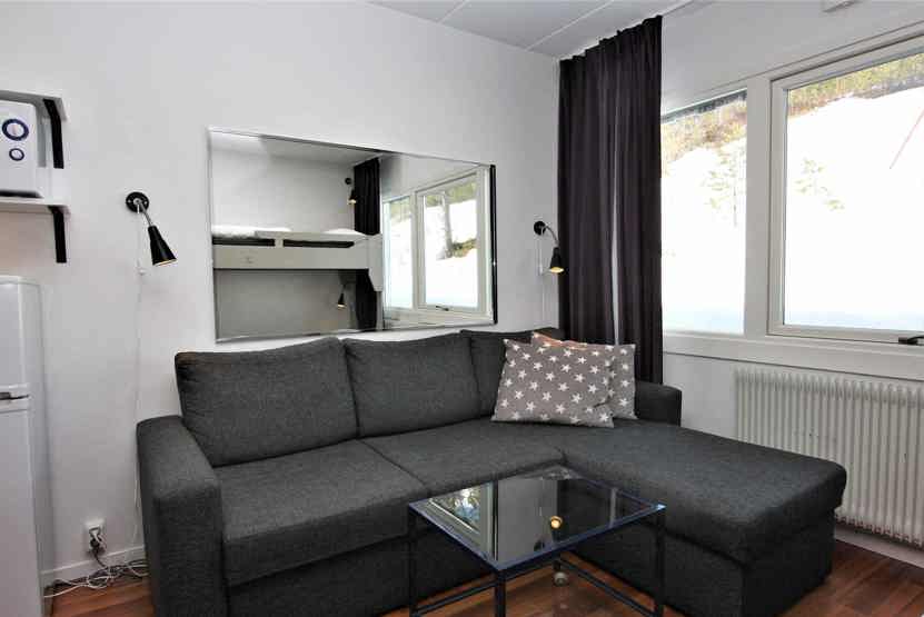Stue med 1 køjeseng med 120 cm bred underkøje, TV, sovesofa til 1 person, kombinerad sov och köksavdelning.