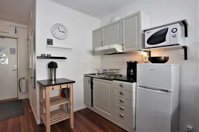 Køkkenet indeholder pentrykök med 2 spisplattor, køleskab med fryser, mikro.