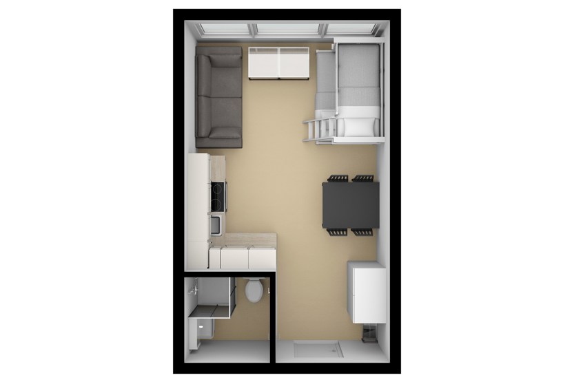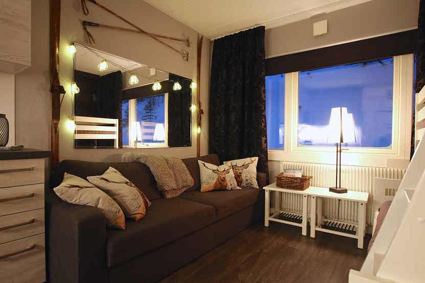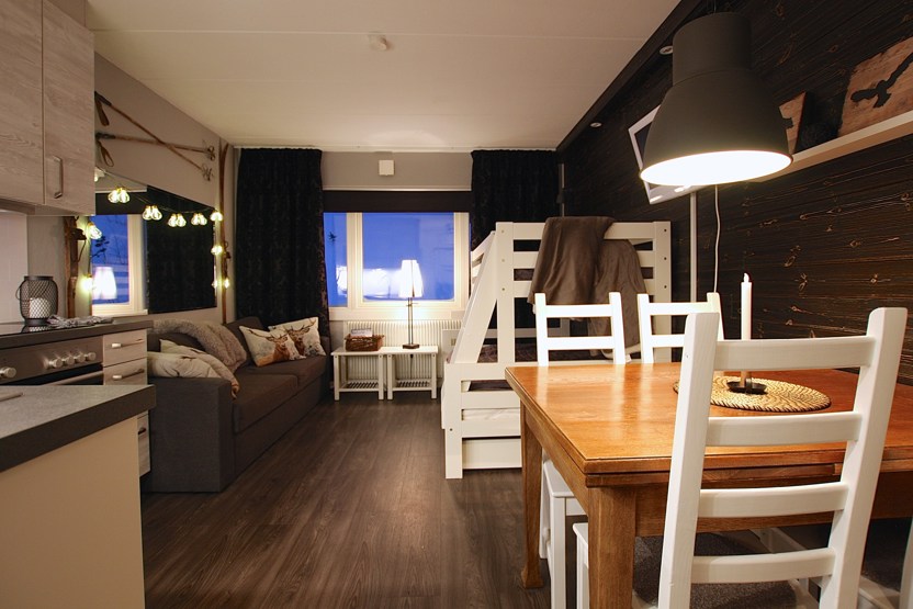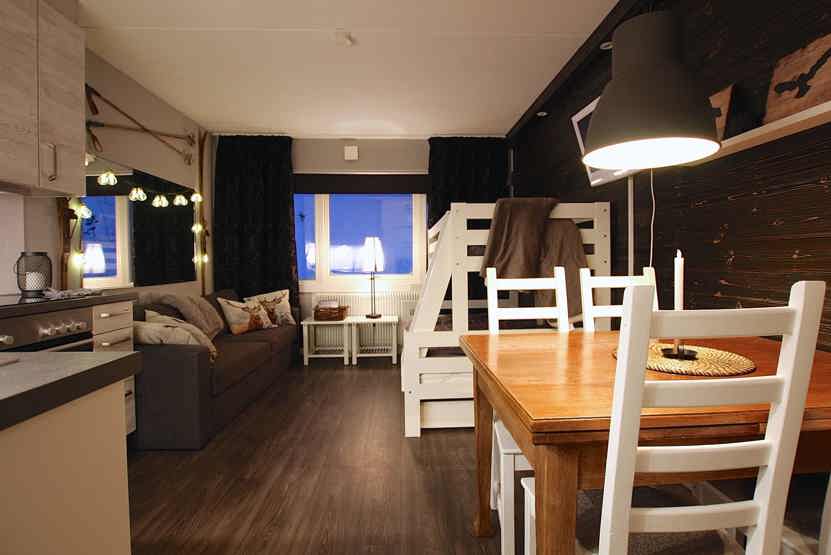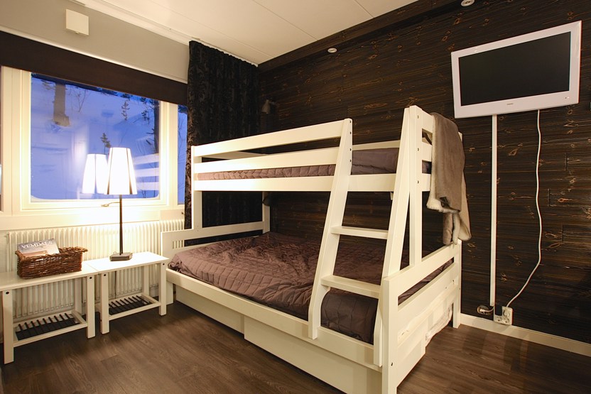 Stue med 1 køjeseng med 120 cm bred underkøje, TV, sovesofa til 1 person, kombinerad sov och köksavdelning.