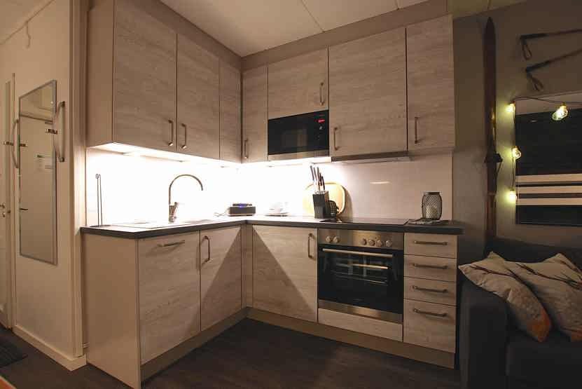 Køkkenet indeholder komfur med ovn, køleskab med fryser, opvaskemaskine, mikro.