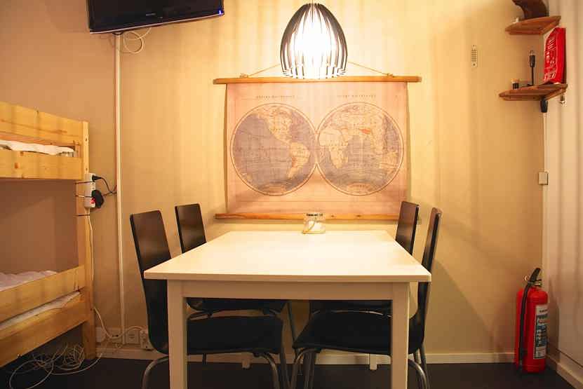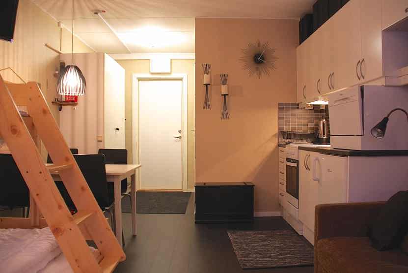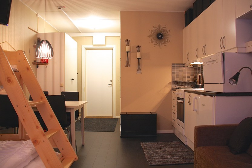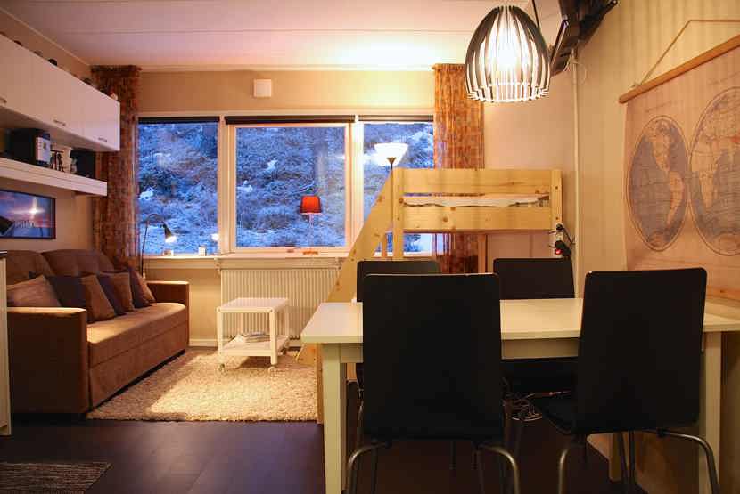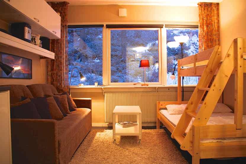 Stue med 1 køjeseng med 120 cm bred underkøje, TV, sovesofa til 1 person, kombinerad sov och köksavdelning.