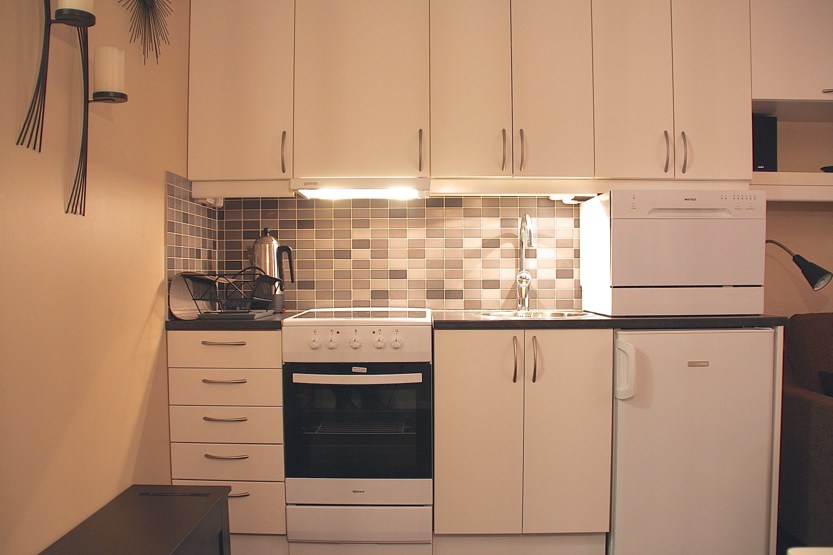 Køkkenet indeholder komfur med ovn, køleskab med fryser, bordopvaskemaskine, mikro.