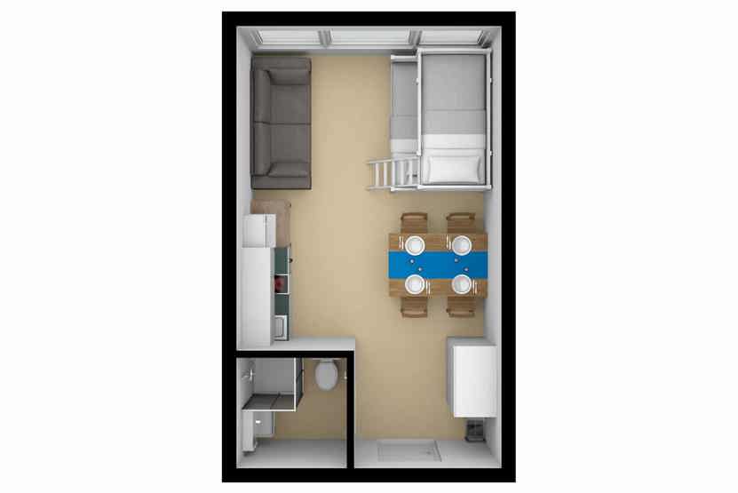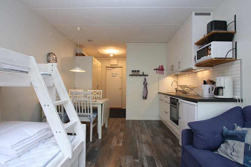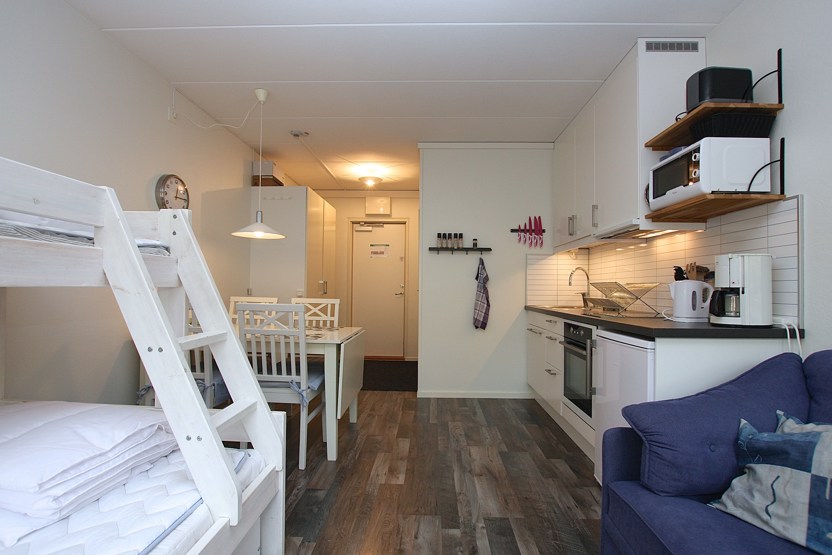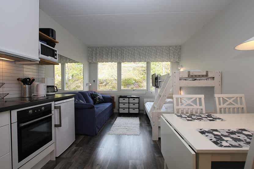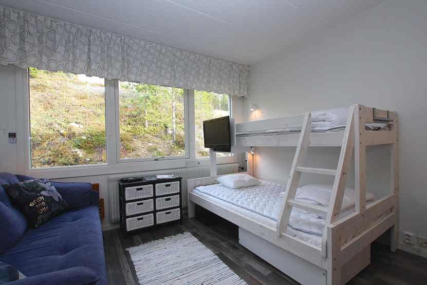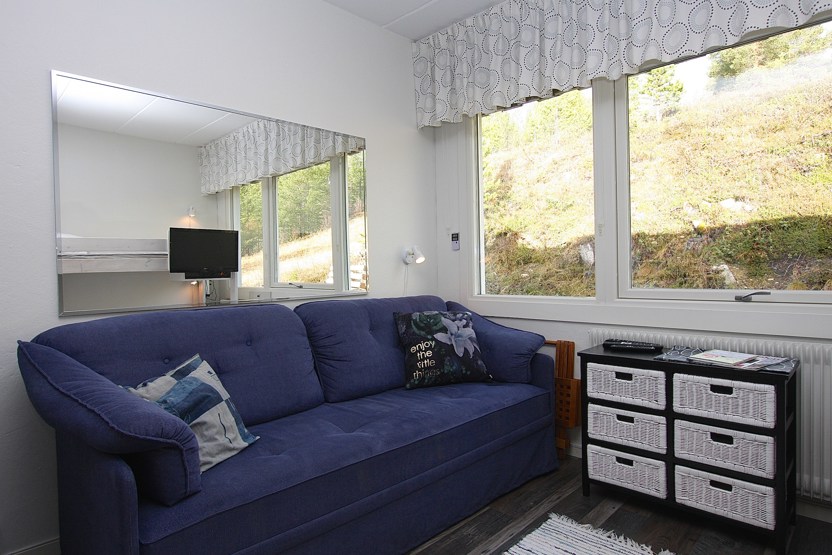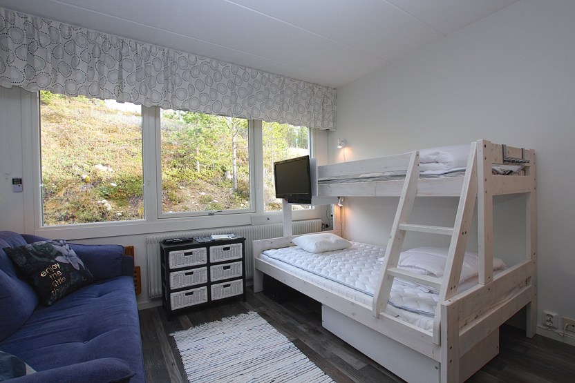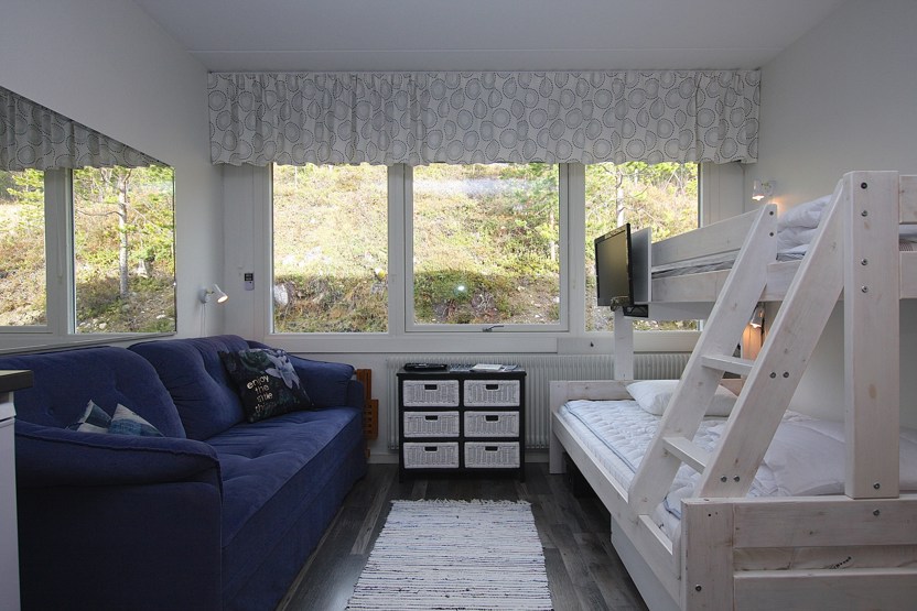 Stue med 1 køjeseng med 120 cm bred underkøje, TV, sovesofa til 1 person, kombinerad sov och köksavdelning.