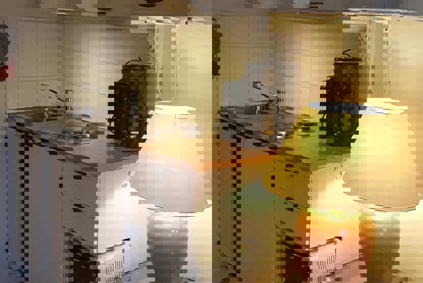 Stue med kombinerad sov och köksavdelning, 1 enkeltseng, 1 køyeseng med 140 cm bred underkøye og 90 cm bred overkøye.