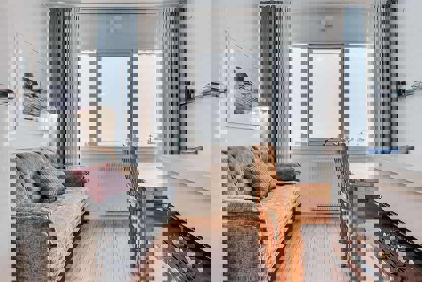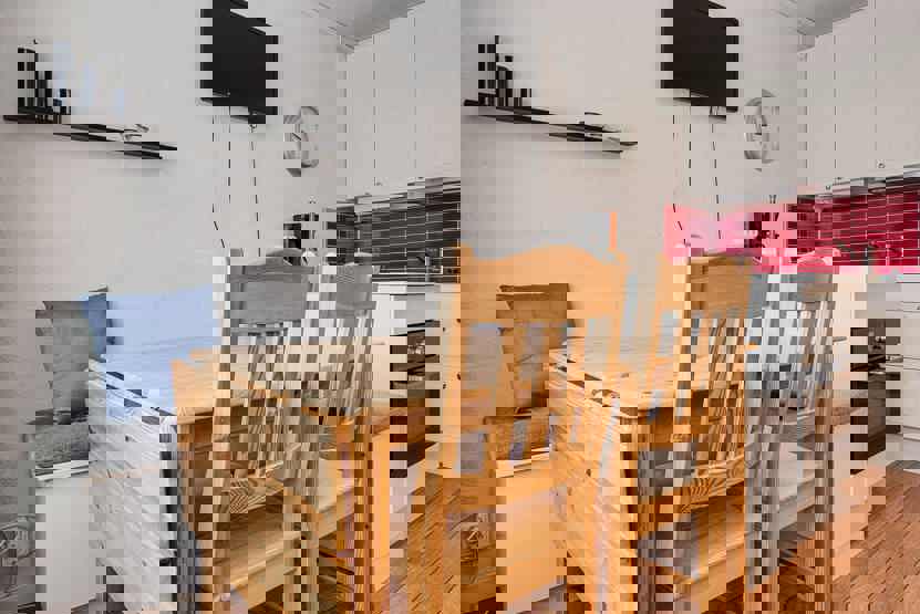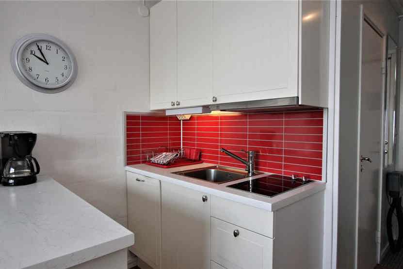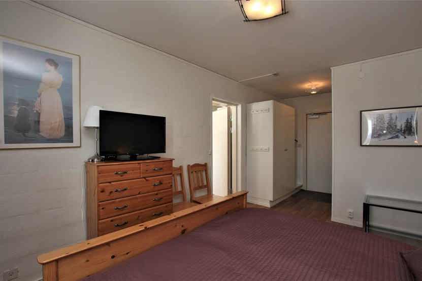 Stue med lille køkkenafdeling, 1 sovesofa 160 cm bred, TV.
