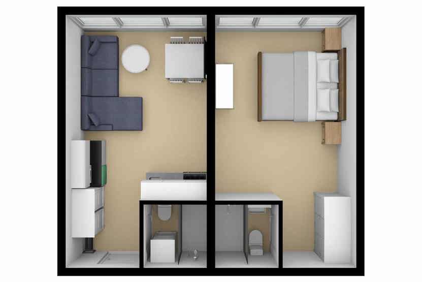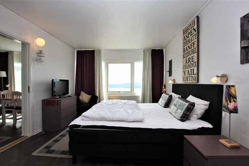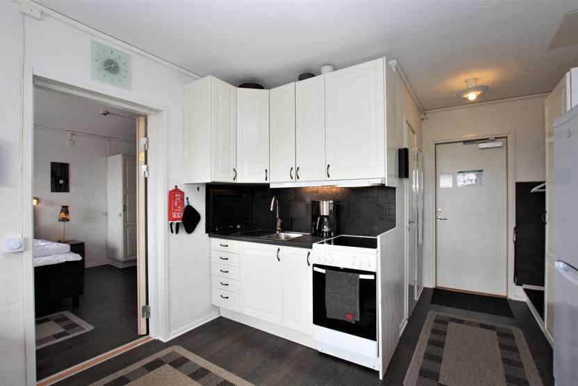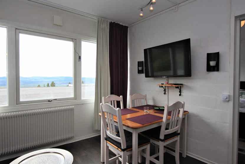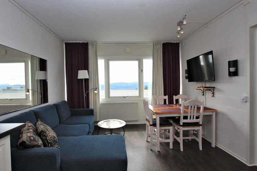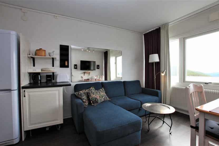Stue med TV, lille køkkenafdeling, sovesofa 140 cm bred.