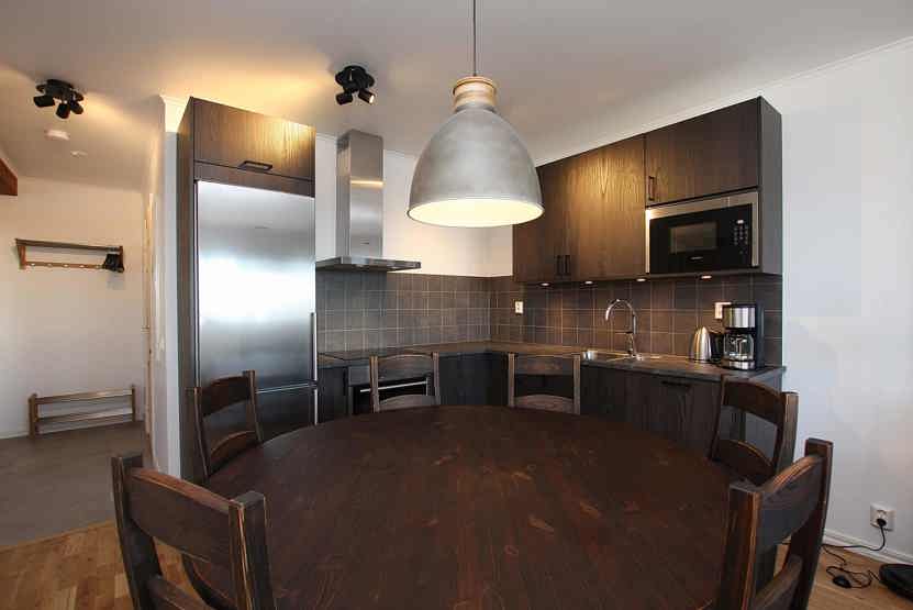 Køkkenet indeholder ovn, mikro, køleskab med fryser, komfur, opvaskemaskine.