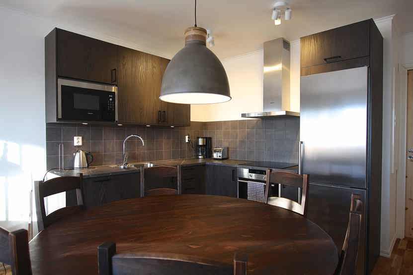 Køkkenet indeholder ovn, mikro, køleskab med fryser, komfur, opvaskemaskine.