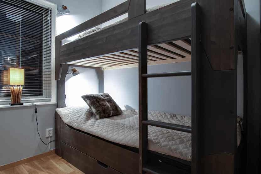 Soveværelse-1 = 1 dobbeltseng 180 cm bred. Soveværelse-2 = 1 køjeseng hvor både over og underkøje er 80 cm bred. Soveværelse-3 = 1 køjeseng hvor både over og underkøje er 80 cm bred.