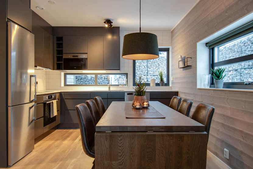 Køkkenet indeholder komfur med ovn, køleskab med fryser, opvaskemaskine, mikro.
