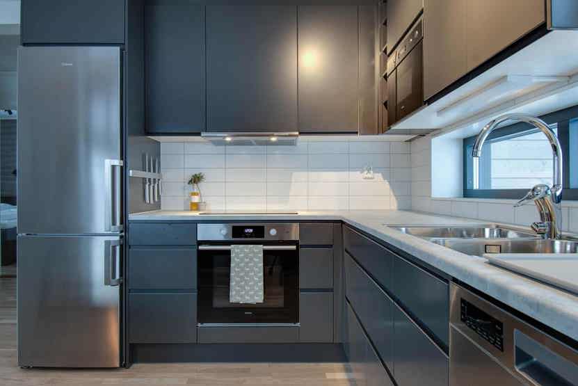Køkkenet indeholder komfur med ovn, mikro, køleskab med fryser, opvaskemaskine.