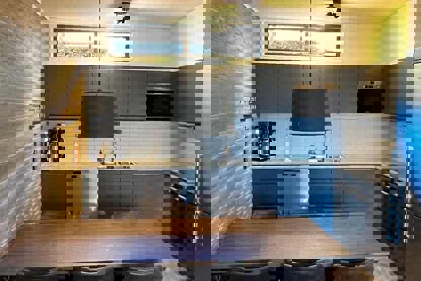 Køkkenet indeholder komfur med ovn, køleskab med fryser, opvaskemaskine, mikro.