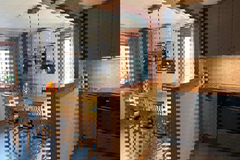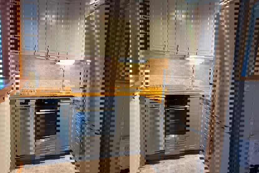 Køkkenet indeholder mikro, køleskab, fryser, opvaskemaskine, komfur med ovn.