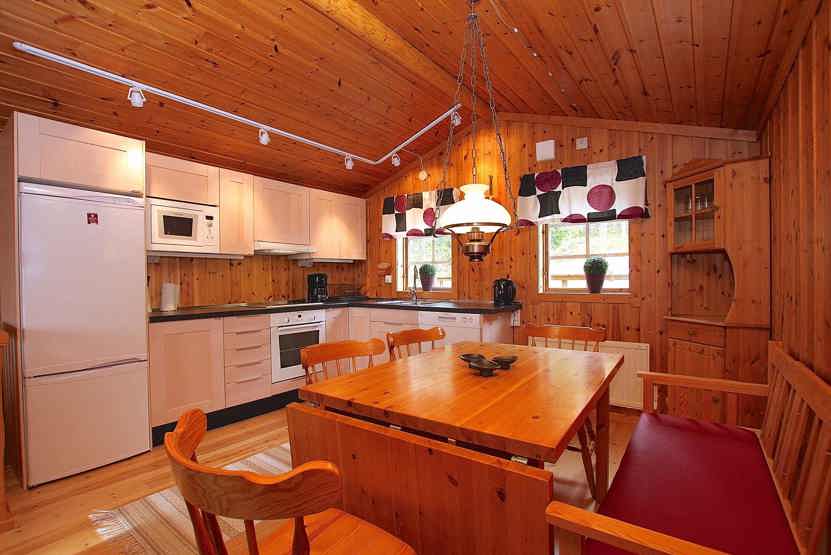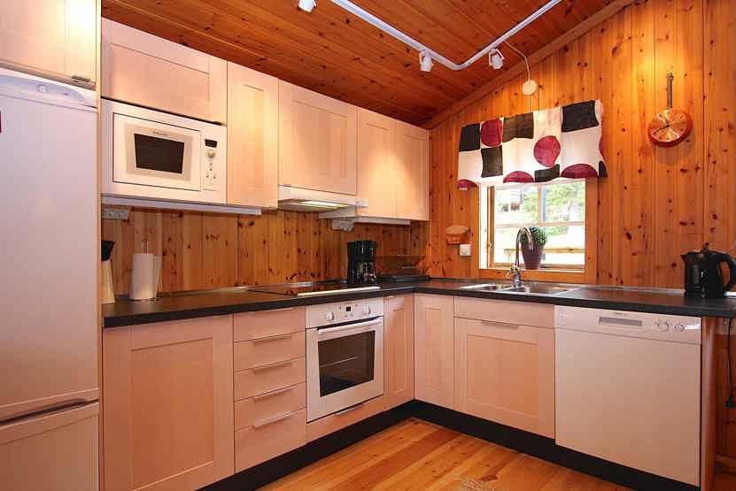 Køkkenet indeholder ovn, mikro, køleskab, komfur, fryser, opvaskemaskine.