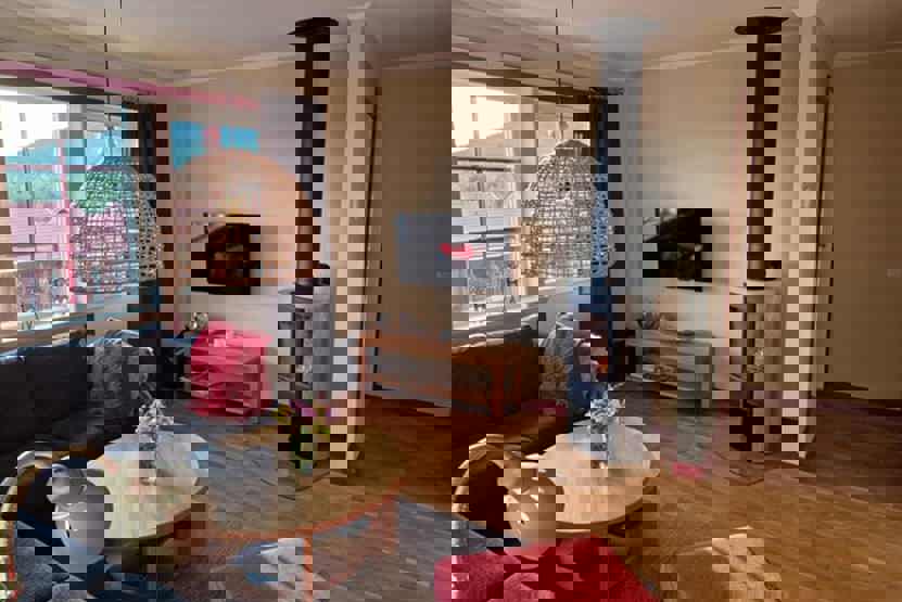 Stue med lille køkkenafdeling, TV, brændeovn (brænde indgår ikke).