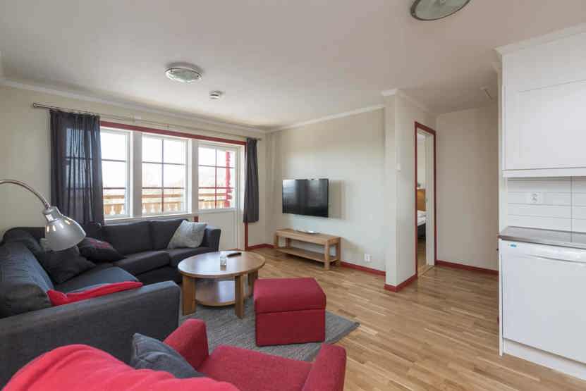 Stue med lille køkkenafdeling, TV.
