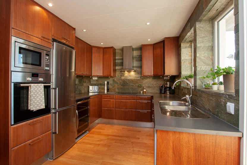Køkkenet indeholder komfur med ovn, mikro, køleskab med fryser, opvaskemaskine.